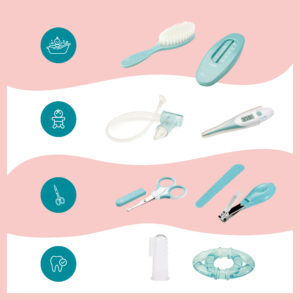 Compact, comprehensive kit of essential baby care accessories for home and travel.