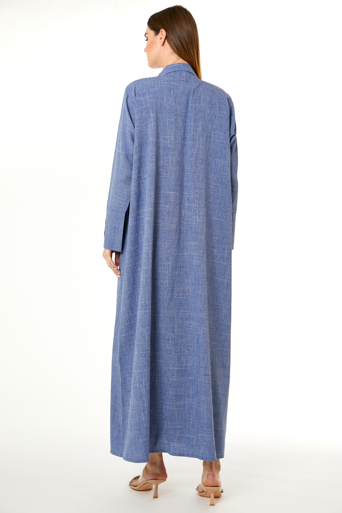 Abaya made from melange fabric with a beautiful Hand Embellishment on front. You can wear it for a night out or even a day out. It has a very beautiful shade of blue and a breathable fabric.