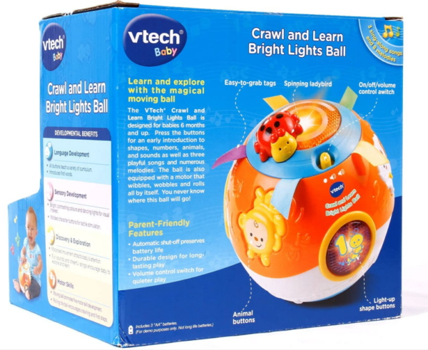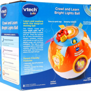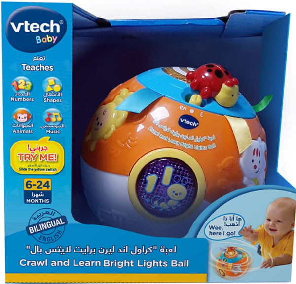 The Vtech Crawl and Learn Bright Lights Ball is designed for babies 6 months and up. Press the buttons for an early introduction to shapes, numbers, animals, and sounds as well as three playful songs and numerous melodies. The ball is also equipped with a motor that wibbles, wobbles and rolls all by itself. You never know where this ball will go. This product is biligual to teach kids in both in English & Bilingual.