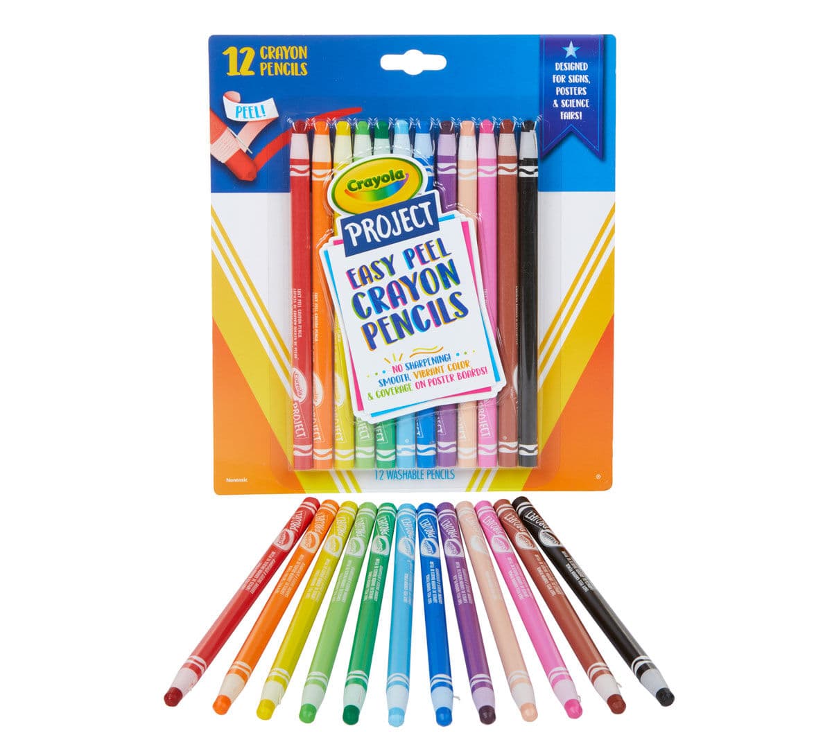 From the Crayola Project line, Easy Peel Crayon Pencils are designed with quick-dry technology and easy peel barrels so that sharpening is never needed! Just peel away layers to expose the color core. Easy Peel Crayon Pencils provide vibrant color coverage and work great on a variety of surfaces. Colors are easily washed from skin and most washable clothing. Includes 12 Washable Crayon Pencils in assorted colors. Ideal for kids, ages 6 and up.