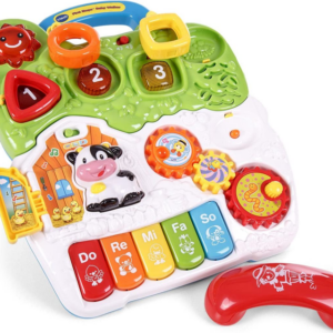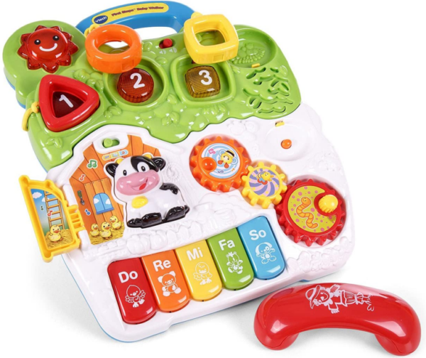 • Moving gears, shape sorters, barn door and rollers develop manipulative skills.