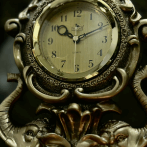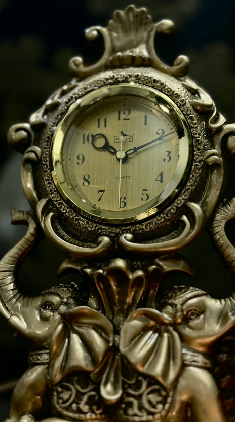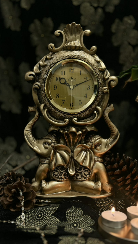 Bring timeless elegance into your space with the Regal Elephants Antique Table Clock — a beautifully crafted masterpiece that embodies luxury and heritage. Featuring a gold-toned ornate frame with intricate detailing, this clock rests gracefully atop two majestic elephants symbolizing strength and prosperity.