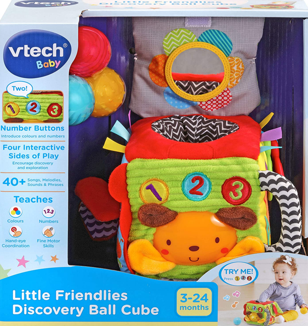 Explore and play with this soft discovery cube! Your little one will love the 4 interactive sides of the Little Friendlies Discovery Ball Cube by VTech®. The cube provides put & take & sensory play through different textured fabrics for baby to explore. The different fabric sides and dog`s shiny face and furry ears provide lots of tactile stimulation. 3 buttons introduce numbers, shapes and fun phrases, while 3 textured balls can be put in and taken out of the cube triggering fun responses. The cube is packed full of sensory fun, interactive phrases, sound effects and includes 3 sing-along songs and 15 melodies.