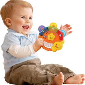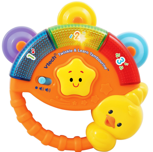 Your baby will love making music with the Twinkle & Learn Tambourine. Tap the star button to learn numbers and hear playful phases and fun sounds. Shake it and hear real tambourine sounds when the electronics are off and hear playful phrases and sounds when they are on. The bird button also plays a variety of melodies. Plays 25+ sing-along songs, melodies, sound effects and fun phrases. Three flashing lights attract attention and the motion sensor encourages motor skill development. Plus, the Twinkle & Learn Tambourine’s small size makes it ideal for take-along play.